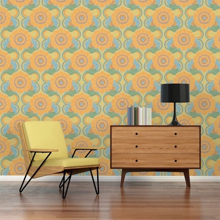 Floral Sun er et iøjnefaldende blomstertapet med klare referencer til 70’ernes farverige formsprog. Mønstret er præget af store, dekorative blomster i blå og gyldne toner, sat mod en varm gul baggrund, der giver tapetet et levende og optimistisk udtryk. Med sin harmoniske balance mellem retrostil og moderne farvevalg skaber Floral Sun en indbydende og personlig stemning – ideel til alt fra entré og stue til kreative kontormiljøer.
