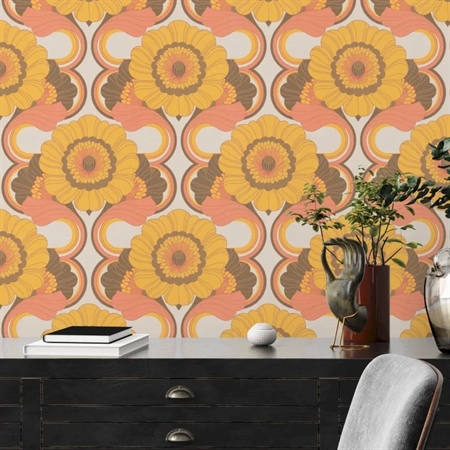 Floral Dawn er et karakterfuldt blomstertapet med tydelige retroreferencer og varme farver. De store blomster i rosa, gyldne og brune nuancer skaber et levende og stemningsfuldt udtryk, der bringer varme og personlighed ind i rummet. Et oplagt valg til dig, der ønsker at tilføje en nostalgisk, men moderne charme til hjemmet.