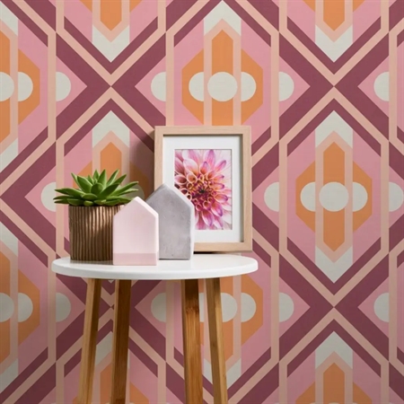 Geometric Blush er et dekorativt tapet med et markant geometrisk mønster og en farvepalette, der emmer af retro charme. De bløde nuancer af rosa, orange og lilla skaber en livlig og varm atmosfære med et moderne twist. Tapetet er oplagt til dig, der ønsker at tilføje farve, rytme og personlighed til dine vægge – uanset om det er i stuen, soveværelset eller entréen.
