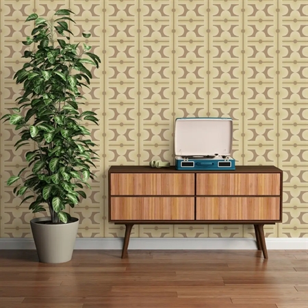 Vintage Sunrise er et varmt og indbydende tapet med et blødt geometrisk mønster i gyldne nuancer. De buede former og fine linjer skaber et roligt, men levende udtryk, der tilfører rummet både dybde og karakter. Tapetet forener retroæstetik med moderne elegance og passer perfekt til dig, der ønsker et tidløst look med et strejf af solrig varme.