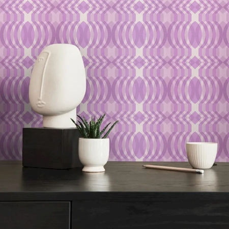 Circle Purple er et geometrisk tapet i blide lavendel- og hvide nuancer med tydelige retroreferencer. Det cirkelbaserede mønster skaber et roligt og elegant udtryk med dybde og visuel interesse. Perfekt til dig, der ønsker en sofistikeret og tidløs vægbeklædning med en blød farvepalette og vintage charme.