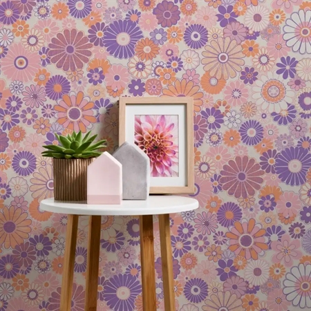 Botanica Blossom er et livligt tapet med et farverigt blomsterdesign, der emmer af retro charme. De dekorative blomster i pink, orange og lilla skaber et legende og energisk udtryk, som bringer varme og personlighed ind i rummet. Perfekt til dig, der ønsker at sætte et markant og kreativt præg på indretningen.