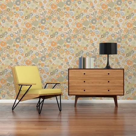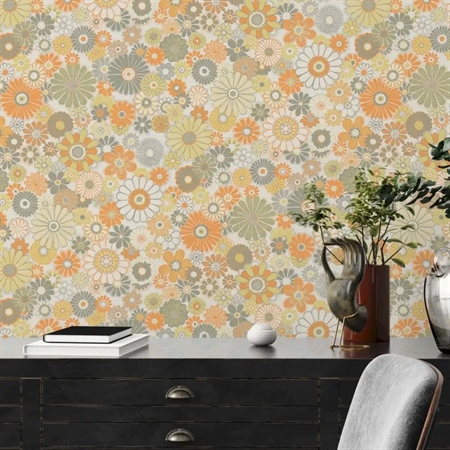 Botanica Lime er et sprudlende blomstertapet med klare referencer til 60’ernes retrostil. Mønstret kombinerer limegrøn, orange og grå i en dynamisk farvepalette, der giver rummet energi og personlighed. Tapetet passer perfekt til dig, der ønsker at tilføje et farverigt, legende udtryk til både moderne og klassiske omgivelser.