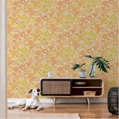 Botanica Citrus er et farverigt blomstertapet med klare referencer til 70’ernes legesyge design. Mønstret kombinerer orange, gul og grøn i en varm og energisk farvepalette, der skaber liv og glæde på væggen. Tapetet er perfekt til dig, der ønsker et frisk pust af retrostil med masser af personlighed.