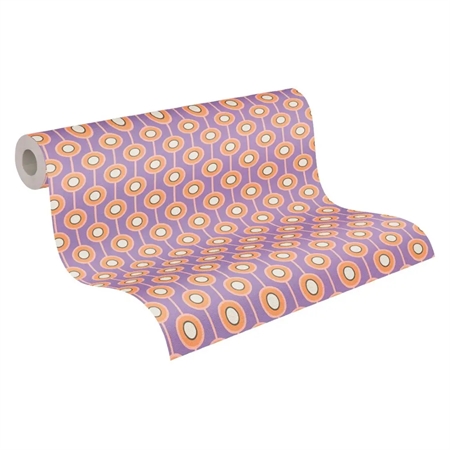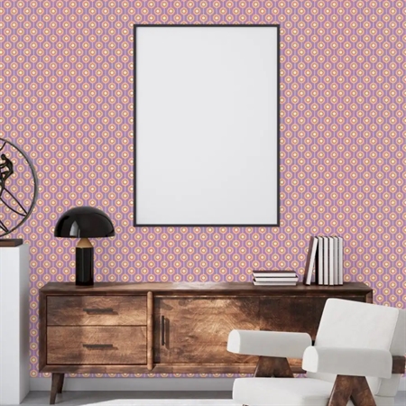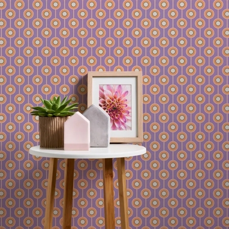 Pop Lavender er et grafisk tapet med et retroinspireret mønster i lilla og lyse nuancer. De rytmiske cirkler og linjer skaber en levende, men afbalanceret vægflade med tydelig 70’er-stemning. Tapetet er ideelt til dig, der ønsker et stilfuldt blikfang med både farve og personlighed.