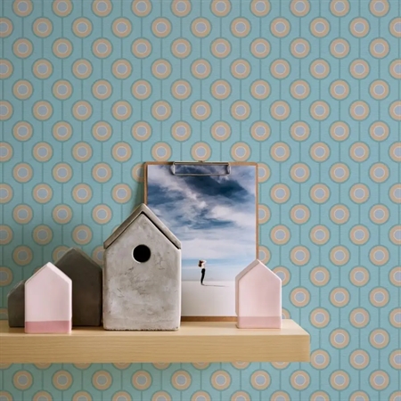 Pop Teal er et retroinspireret tapet med grafiske cirkler og linjer i en beroligende blågrøn pastel. Det geometriske mønster skaber dybde og rytme, mens farvetonen giver rummet en let og afslappet stemning. Tapetet passer perfekt til dig, der ønsker et stilrent og nostalgisk udtryk med et moderne twist.