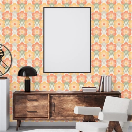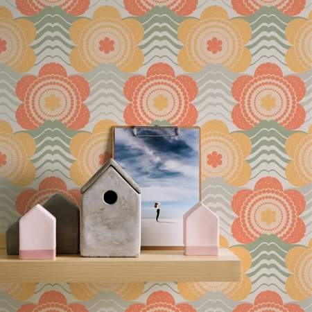 Organic Coral er et farverigt tapet med stiliserede blomster i koral, mint og gule nuancer. Mønstret kombinerer retroblomster med moderne farvespil og skaber en frisk og legende atmosfære. Tapetet passer perfekt til dig, der ønsker et livligt og karakterfuldt udtryk med vintage charme.