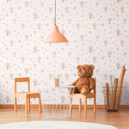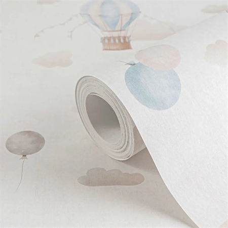 Sky Dreams fra vores Lilly & Luis kollektion forvandler ethvert børneværelse til et sted fyldt med fantasi og ro. Med sine håndtegnede luftballoner, bløde skyer og diskrete guirlander i pasteltoner som lyseblå, rosa og creme, skaber det en drømmeagtig og indbydende stemning. Mønsteret fremstår let og legende uden at virke overvældende – perfekt til både leg og ro.