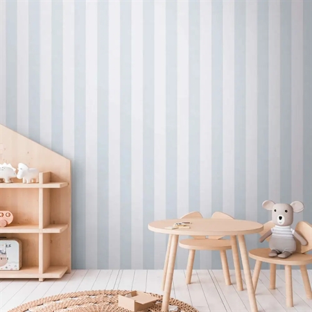 Lilly Stripe tapet fra vores Lilly & Luis kollektion bringer enkelhed og ro ind i børneværelset med sit elegante blokstribemønster i lyseblå og cremehvide nuancer. De lodrette, let tonede striber skaber struktur og visuel højde i rummet – et tidløst design, der passer perfekt til både småbørns- og skolebørns værelser. Mønstret fremstår afdæmpet og raffineret, uden at virke overvældende – ideelt som en rolig baggrund, der alligevel har personlighed.