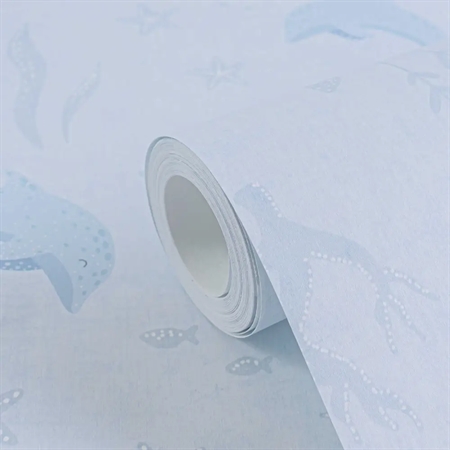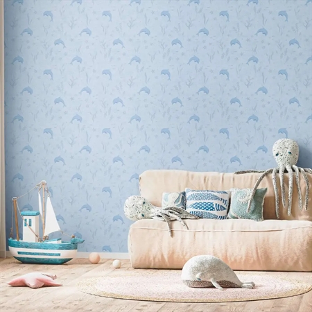 Underwater fra vores Lilly & Luis kollektion åbner et magisk undervandsunivers i børneværelset. Motivet er fyldt med glade delfiner, fine koraller og små havbeboere i blå og hvide pasteltoner, som svæver roligt gennem tapetets overflade. Designet emmer af legen og fantasien, uden at blive for voldsomt – perfekt til at skabe en beroligende og inspirerende baggrund.