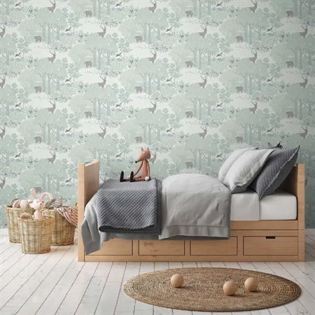 Forest fra vores Lilly & Luis kollektion inviterer naturens ro ind i børneværelset med et eventyrligt skovtema. Designet viser blide trækroner, diskrete dyrefigurer og sart grønne toner, som stille folder sig ud over væggen og skaber en drømmende, næsten eventyrlig atmosfære — ideel som en beroligende baggrund for leg og ro.