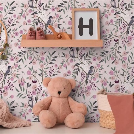 Enchanted Garden fra vores Lilly & Luis kollektion forvandler børneværelset til en magisk blomsterhave, hvor små fugle og fine blomster i sarte pink-, lilla- og grønne nuancer svæver let hen over overfladen. Det detaljerede og håndtegnede mønster skaber en følelse af eventyrlig livlighed og ro – en perfekt ramme for både fantasifuld leg og stille øjeblikke.