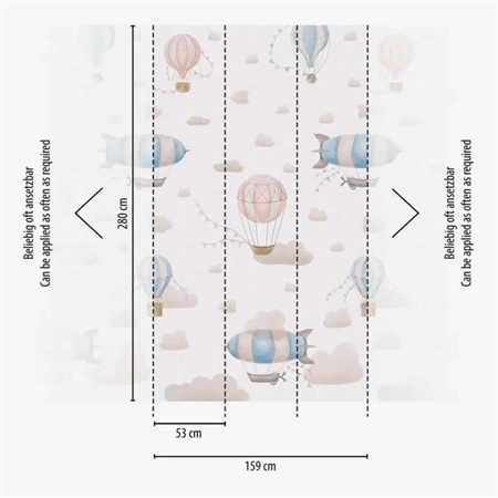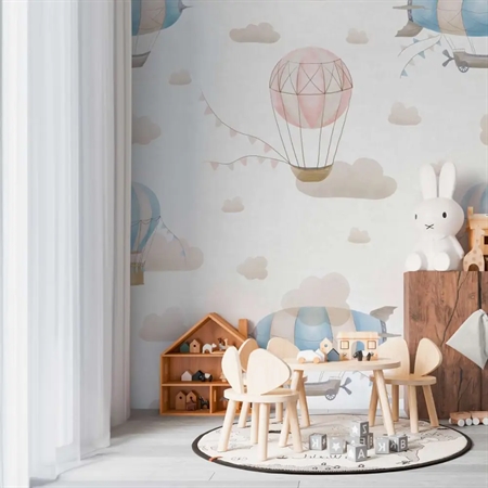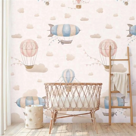 Fra vores Lilly & Luis kollektion kommer dette drømmende tapet med svævende luftballoner og bløde skyer i sarte blå, creme og lyserøde nuancer. Et let og legende design, der skaber en rolig himmelstemning på børneværelset – perfekt til små opdagelsesrejsende med store drømme.