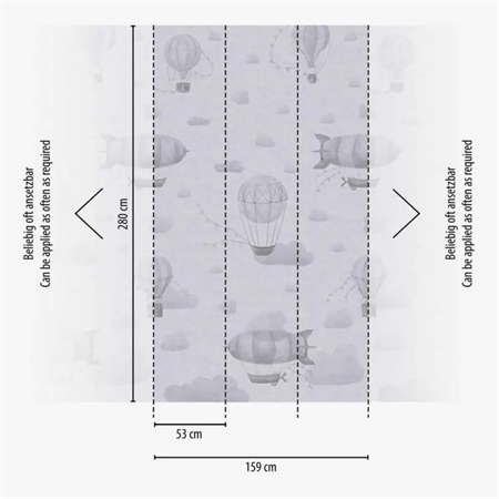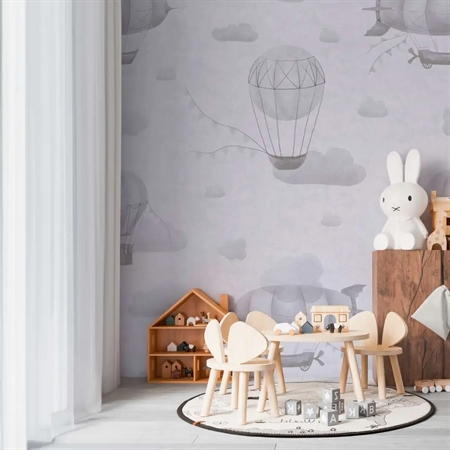 Fra vores Lilly & Luis-kollektion låner dette tapet det blide udtryk fra himlen med svævende luftballoner og bløde skyer i sarte grå toner. Motivet skaber en rolig og drømmende atmosfære i børneværelset – perfekt til små eventyrere, der elsker fantasifuld indretning med et stille farvespil.