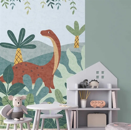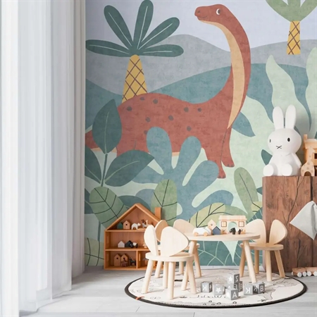 Fra Lilly & Luis-kollektionen kommer dette farverige paneltapet med venlige dinosaurer midt i en frodig forhistorisk verden. De glade grønne, blå og varme nuancer skaber en livlig og tryg stemning i børneværelset – ideelt til små opdagelsesrejsende med vild fantasi.