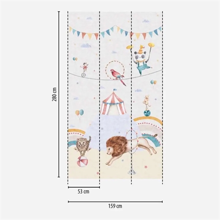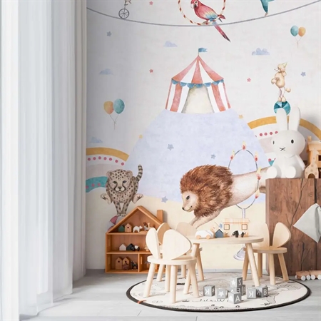 Circus Magic på et fantasifuldt cirkusunivers med glade dyr og sprudlende farvedetaljer. Tapetet bringer leg, fest og kreativ stemning ind i børneværelset – perfekt til små opdagelsesrejsende, der elsker eventyr og farver.
