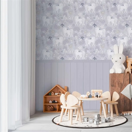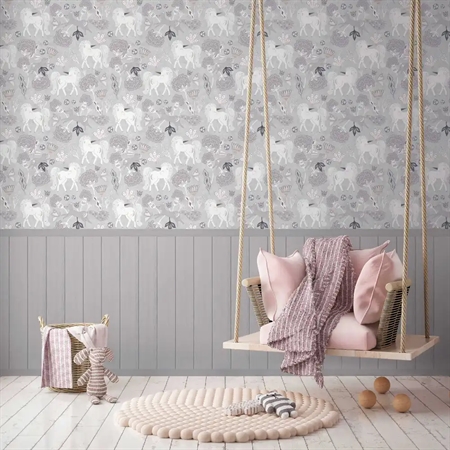 Fra Lilly & Luis-kollektionen kommer dette eventyrlige tapet med enhjørninger og fine mønstre i rolige grå, rosa og hvide toner. Det skaber en blid og drømmende stemning på børneværelset – perfekt til små romantikere, der elsker magi, leg og hyggelige eventyr.