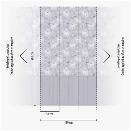 Banerne kan nemt tilpasses i højden ved loft og fodliste. Er væggen højere end motivet, kan man centrere motivet og male/opsætte ensfarvet tapet over eller under for en harmonisk afslutning.