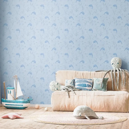 Fra Mia & Paul-kollektionen kommer dette legende tapet med små delfiner og havplanter på en lys blå baggrund. Motivet skaber en frisk og rolig stemning – perfekt til børneværelset, hvor fantasien kan svømme frit i en fredelig undervandsverden.