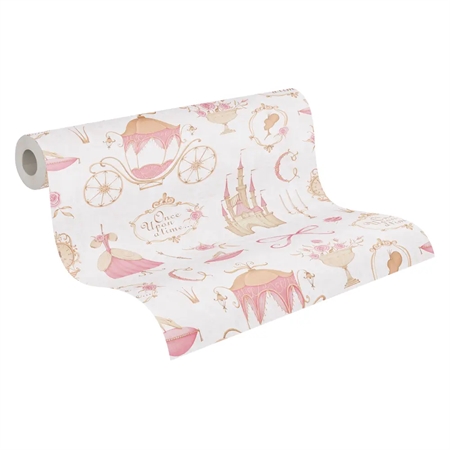 Fra Mia & Paul-kollektionen kommer dette eventyrlige tapet med slotte, prinsesser, kroner og sløjfer i rosa og gyldne nuancer. Designet skaber en magisk og legende stemning – perfekt til små drømmere, der elsker historier om kongeriger og fantasi.