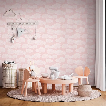 Fra Mia & Paul-kollektionen kommer dette rolige tapet med hvide skyer på en lys rosa baggrund. Det enkle mønster og de bløde farver skaber en harmonisk atmosfære – perfekt til børneværelset eller hjemmets rolige kroge.