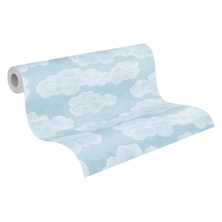 Fra Mia & Paul-kollektionen kommer dette rolige tapet med hvide skyer på en lyseblå baggrund. Det enkle mønster og de bløde farver skaber en harmonisk atmosfære – perfekt til børneværelset eller hjemmets rolige kroge.