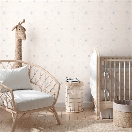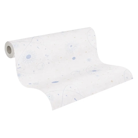 Fra Mia & Paul-kollektionen kommer dette drømmende tapet med stjerner, planeter og galakser på en hvid baggrund. Det kosmiske mønster skaber en magisk og rolig atmosfære – perfekt til små opdagelsesrejsende, der drømmer om universets mysterier.