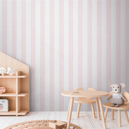 Fra Mia & Paul-kollektionen kommer dette klassiske tapet med lyserøde og hvide striber. Det enkle og tidløse design tilfører rummet en følelse af højde, lethed og charme – perfekt til børneværelset eller andre rum, hvor du ønsker et lyst og luftigt udtryk.