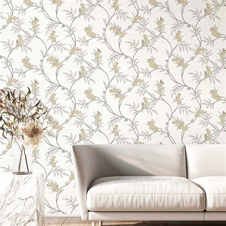 Skab en rolig og elegant stemning i hjemmet med Arche 33301 – et smukt tapet med fine blomstergrene i afdæmpede gule og grå toner på en blød cremefarvet baggrund. De yndefulde grene slynger sig let over væggen og tilfører rummet en diskret naturlighed og klassisk charme.