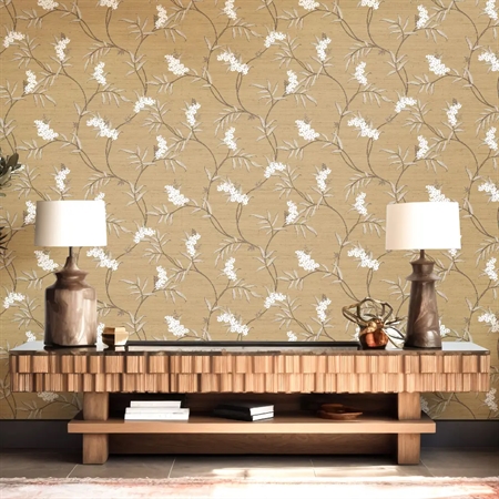 Skab en varm og indbydende atmosfære med Arche 33307 – et smukt blomstertapet med elegante grene og små hvide blomster, der slynger sig yndefuldt hen over en gyldenbrun baggrund. De fine grå og lilla blade tilfører designet ekstra dybde og gør tapetet både tidløst og elegant.