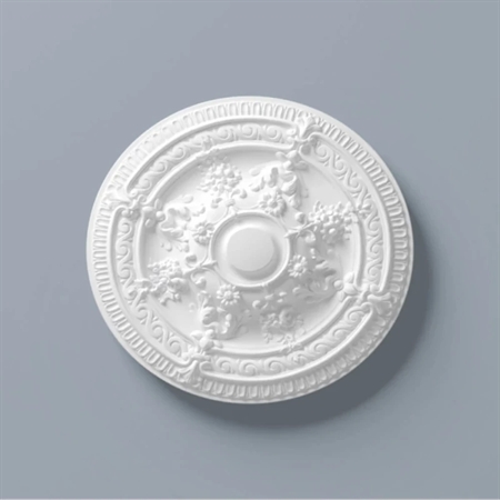 Roset i hårdt PU-skum (polyurethan) udformet i et flot klassisk design med små fine detaljer. Kan bruges i alle tørre rum såsom stue, værelser og køkkener. Rosetten er formalet fra fabrikken og kan overmales med almindelige typer acryl- og alkydmalinger. Rosetten er lavet i polyurethan af højeste kvalitet. Det giver rosetten en ekstremt hård overflade, hvilket bl.a. også betyder, at det er ganske svært at se forskel på denne roset og en "ægte" som er fremstillet i gips. Denne roset kan også bruges ved lampeudtag.