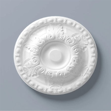 Roset i hårdt PU-skum (polyurethan) udformet i et flot klassisk design. Kan bruges i alle tørre rum såsom stue, værelser og køkkener. Rosetten er formalet fra fabrikken og kan overmales med almindelige typer acryl- og alkydmalinger. Rosetten er lavet i polyurethan af højeste kvalitet. Det giver rosetten en ekstremt hård overflade, hvilket bl.a. også betyder, at det er ganske svært at se forskel på denne roset og en "ægte" som er fremstillet i gips. Denne roset kan også bruges ved lampeudtag.