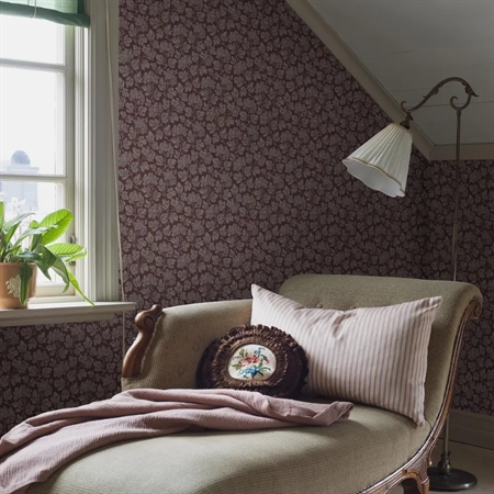 Hagtorn er et klassisk tapetmotiv fra perioden 1915-1920, hvor tætte botaniske mønstre og mere tekstile udtryk igen blev populære – som en modvægt til jugendstilens luftige idealer. Her breder hvidtjørnen sig i fyldige blomsterklaser og smukt fligede blade, og den diskrete stribe i baggrunden giver tapetet et varmt, tekstilinspireret udtryk.