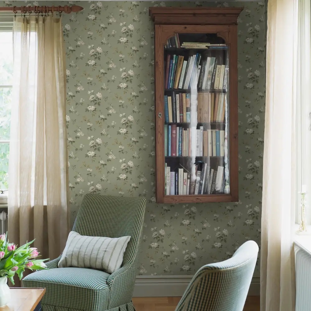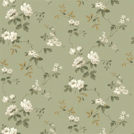 Her ses Värmdö i en naturlig og rolig farvesammensætning med hvide og beige roser i grågrønt og gulbrunt løv på en blød lindeblomstgrøn bund. Et behageligt og klassisk tapet, der giver rummet et lyst og harmonisk præg.