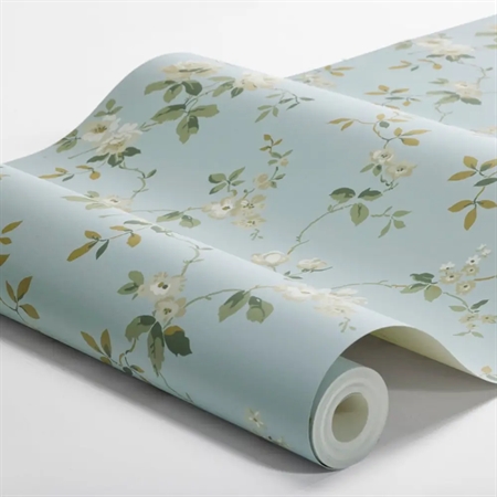 Her ses Värmdö limtrykt i en lyseblå nuance med roser i hvidt og beige, omgivet af løv i grågrønne og gulbrune toner. Et frisk og venligt tapet, der giver rummet et lyst, romantisk og klassisk præg.