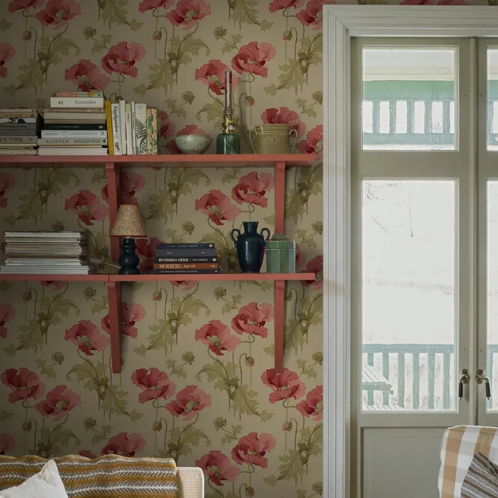 Vallmo er et storblomstret art nouveau-tapet fra begyndelsen af 1900-tallet, hvor naturens former og organiske linjer satte tonen i designet. Her ses den ikoniske valmue i dybe røde nuancer omgivet af gulgrønne, snørklede blade, knopper og frøkapsler. Baggrunden er sart beige med et strejf af gylden okker, som giver motivet varme og dybde.