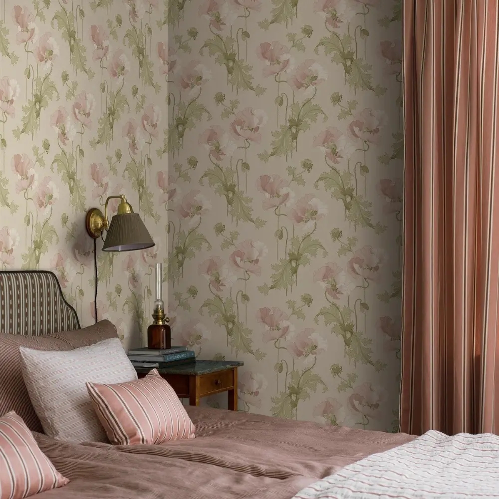 Her ses Vallmo i et romantisk farveudtryk med sartrosa blomster og lindeblomstgrønt løv, knopper og frøkapsler på en lys beige bund. Et venligt og harmonisk tapet, der skaber et blødt, klassisk udtryk i rummet.