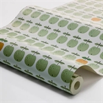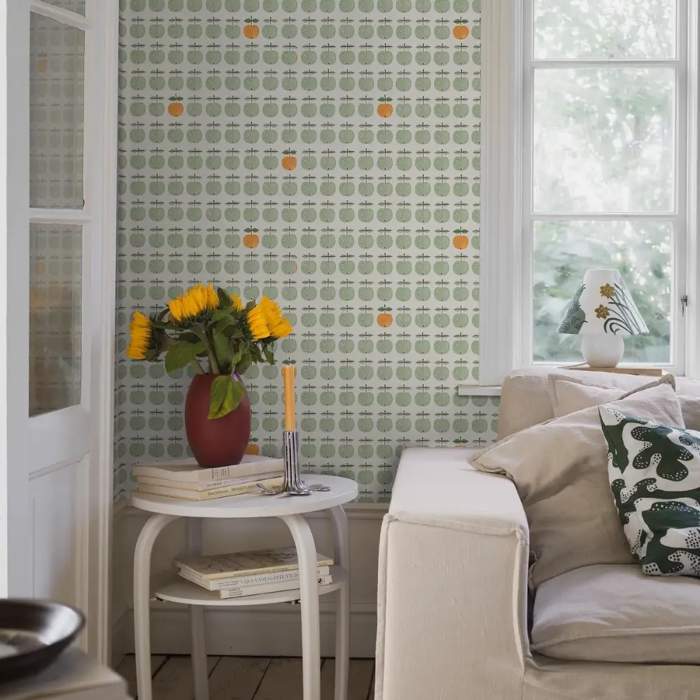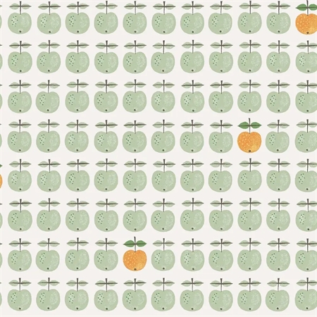 Her ses Pall i en frisk, grøn farvevariant på hvid bund, hvor de karakteristiske æbler fremstår i bløde grønne nuancer med enkelte gulorange accenter. En let og indbydende palette, der tilfører rummet et lyst og moderne præg – ideel til både køkken, spisestue eller opholdsrum.