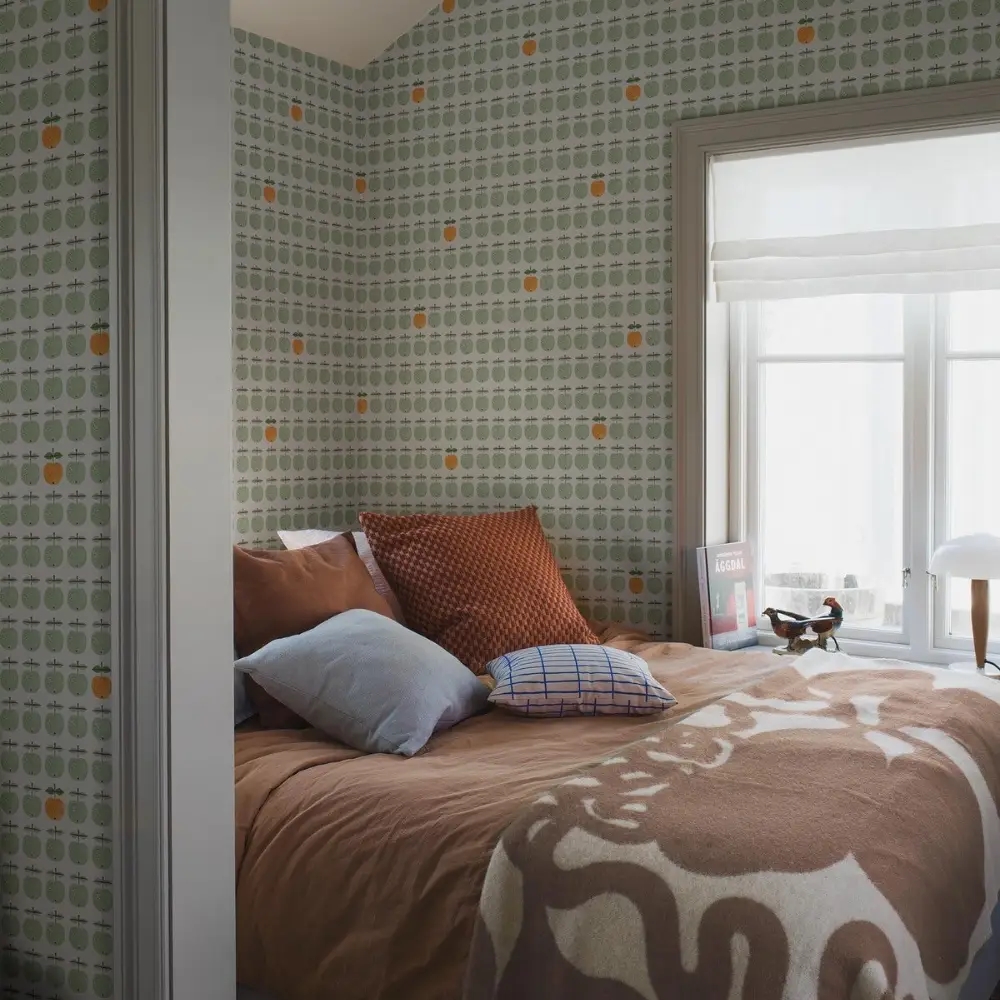 Pall er et grafisk og legende tapet designet af Stig Lindberg, hvor stiliserede æbler danner et rytmisk og dekorativt mønster. Designet stammer fra 1960’erne og er en tidløs klassiker, hvor det enkle formsprog og de gentagende elementer skaber et levende, men balanceret udtryk.