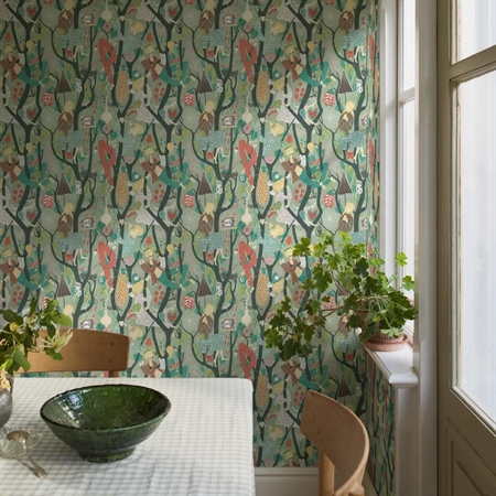 Melodi er et fantasifuldt og detaljerigt tapet designet af Stig Lindberg, hvor et levende mønster folder sig ud med finurlige former og små, legende elementer. Jo længere du betragter overfladen, desto flere detaljer træder frem og giver tapetet karakter og dybde. Mønstret blev oprindeligt lanceret i 1947 og står i dag som en tidløs klassiker, der stadig føles både relevant og inspirerende.