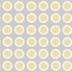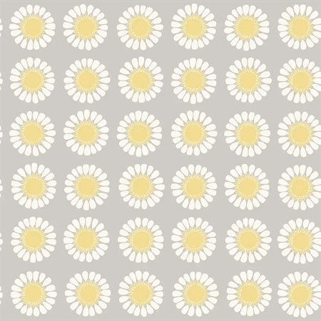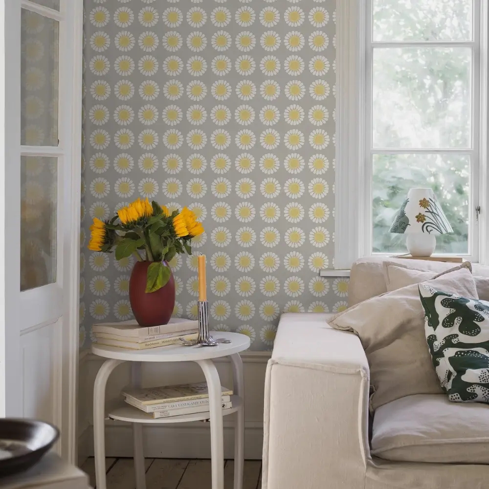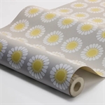 Her ses Daisy i en ny, lys farvevariant med margueritter i hvidt og gult på en blødt varmgrå bund. En rolig og indbydende farvesammensætning, der giver rummet et lyst og behageligt præg – velegnet til både køkken, stue eller soveværelse.