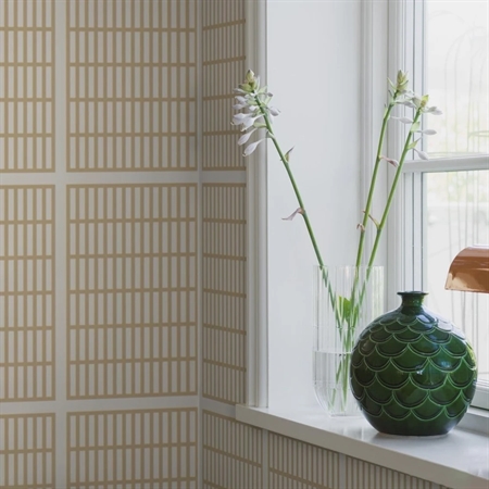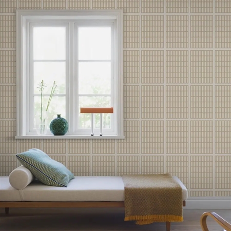 14/6 er et stramt og grafisk tapet, hvor et murstensinspireret mønster danner en klar og rytmisk struktur. Designet blev skabt af Alvar Aalto i 1940’erne til NK’s tekstilkammer og afspejler hans arkitektoniske tilgang med fokus på balance, proportioner og gentagelser.