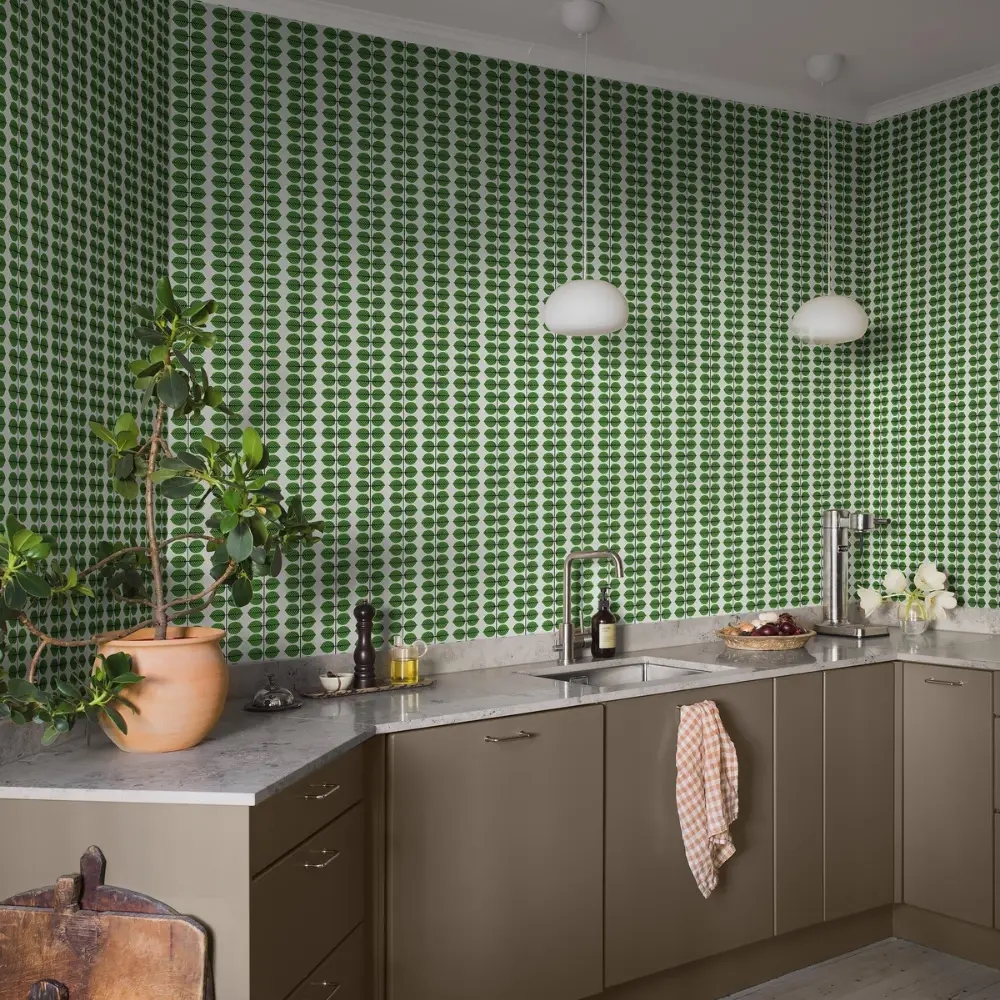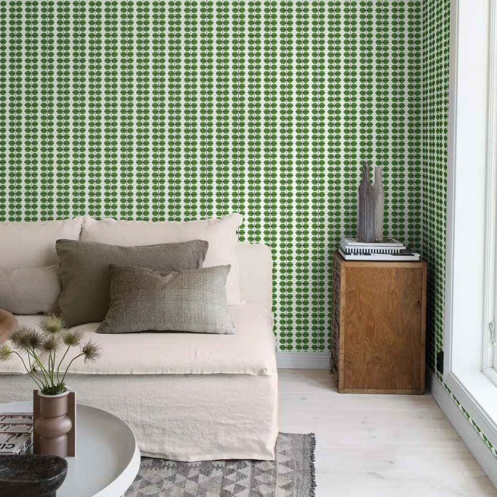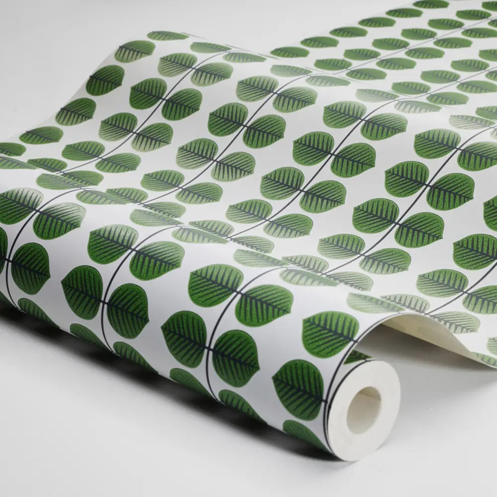 Her ses Berså i den klassiske farvesammensætning med grønne blade og sorte bladnerver på en hvid bund – tro mod originalen fra 1960’erne. Et stilrent tapet med tydelig retrostemning, der passer perfekt til både køkken, spisestue eller andre rum, hvor du ønsker et grafisk og tidløst udtryk.