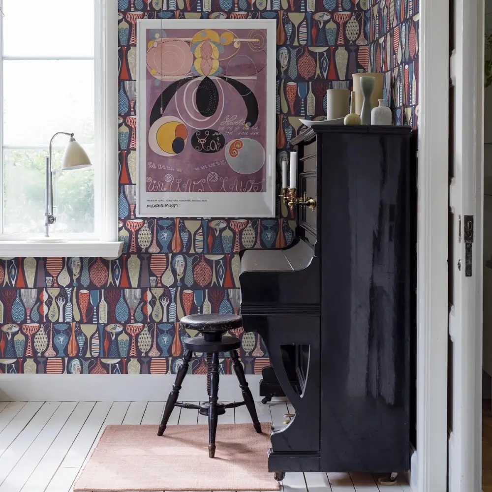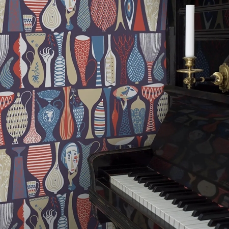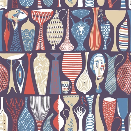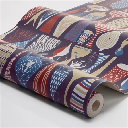 Her ses Pottery i en markant farvesammensætning med nuancer af blå, rød, beige og hvid på en dyb blålilla, næsten sort bund. Et stemningsfuldt tapet, der skaber kontrast og karakter i rummet – ideelt til stue, spisestue eller andre rum, hvor du ønsker et grafisk og iøjnefaldende udtryk.