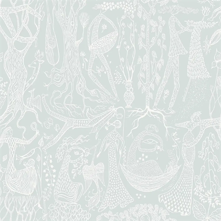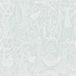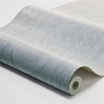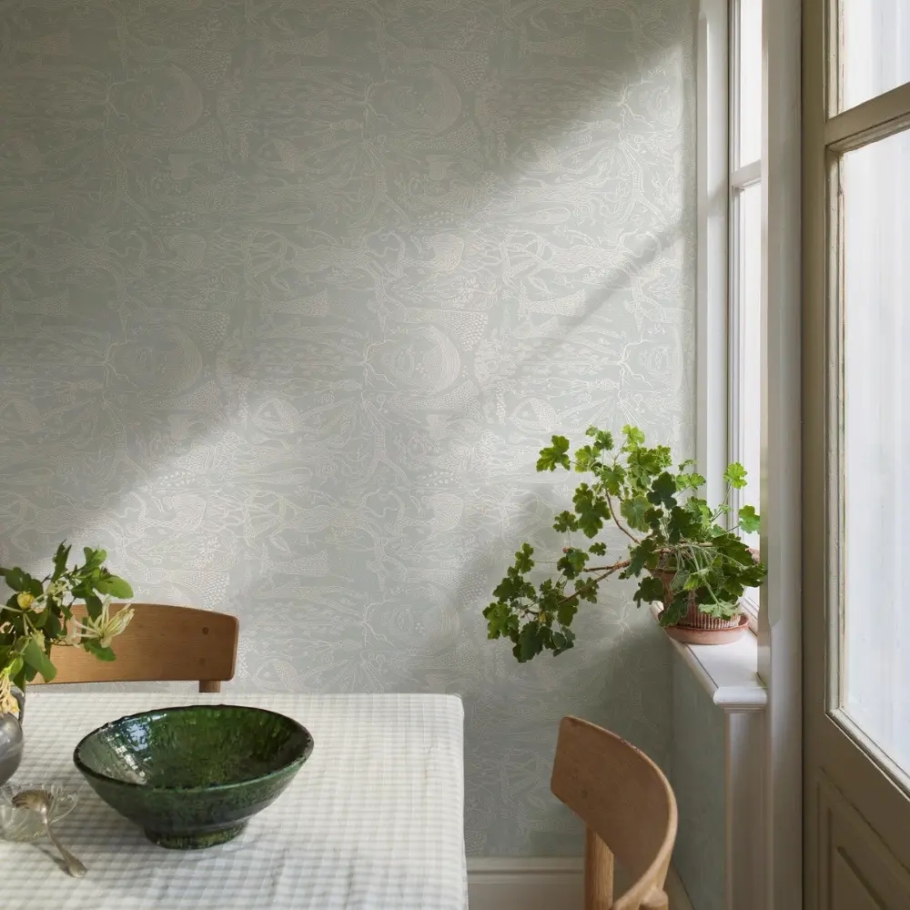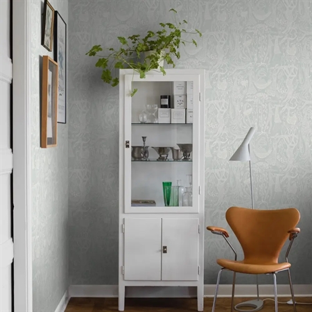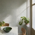 Her ses Poème d’amour med et fint, hvidt mønster på en lysegrågrøn bund. En rolig og afdæmpet farvesammensætning, der fremhæver de mange detaljer og giver tapetet et elegant og let udtryk – velegnet til både stue, soveværelse eller entré.