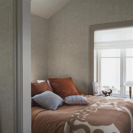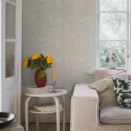 Her ses Poème d’amour med fine, hvide detaljer på en sandbeige bund. En varm og afdæmpet farvesammensætning, der giver tapetet et roligt og elegant udtryk – velegnet til både stue, soveværelse eller entré.