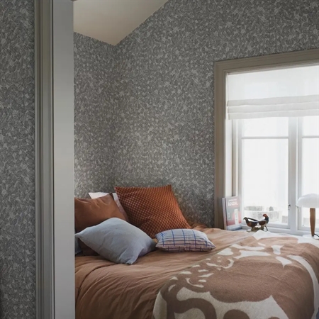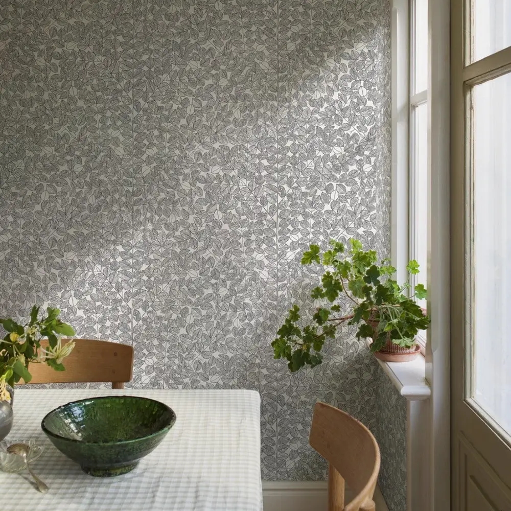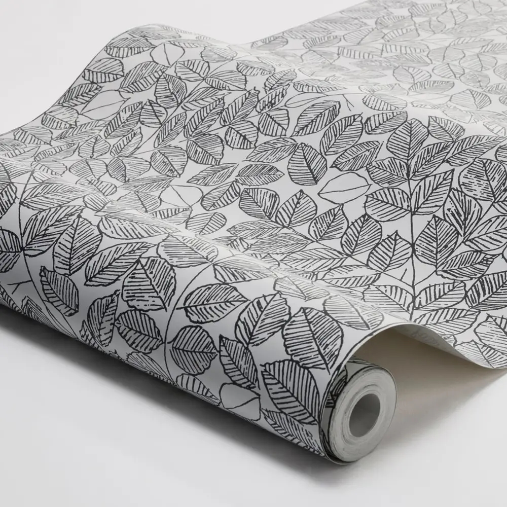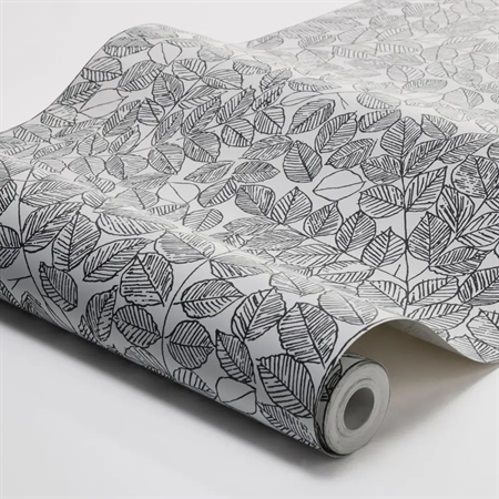 Her ses Romans i en enkel, monokrom farveskala med sorte blade på en hvid bund. Den rene kontrast fremhæver mønstrets lethed og giver et stilrent udtryk – velegnet til både stue, soveværelse eller entré.