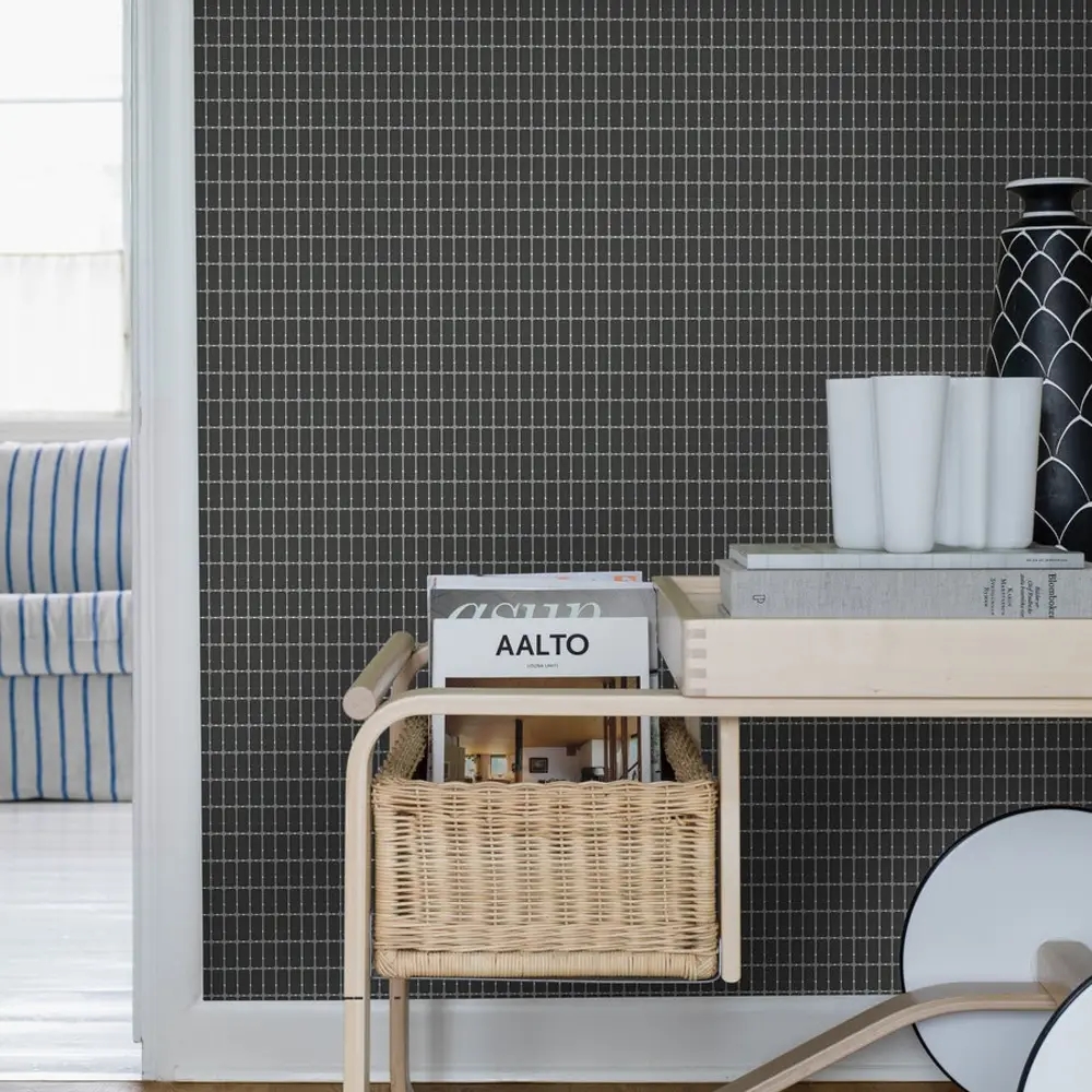 Alvar Aalto M.I.T er et grafisk og arkitektonisk tapet, hvor et murstensinspireret mønster skaber en stram og rytmisk struktur. Designet stammer fra 1940’erne og blev udviklet i forbindelse med kollegiet Baker House, hvor Aalto lod sig inspirere af bygningens geometriske facade. Et enkelt, men gennemtænkt mønster med stærk visuel effekt.