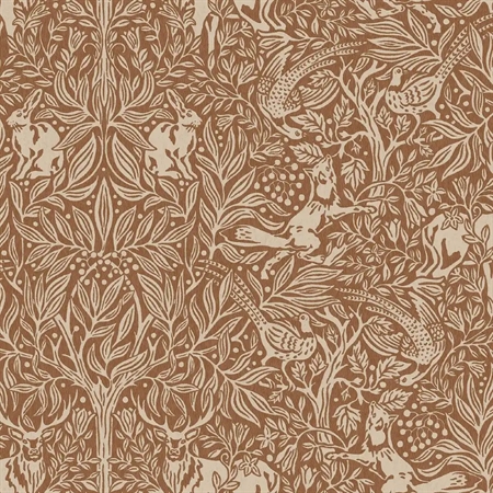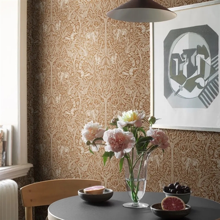 Under the Elder Tree er et rigt og stemningsfuldt tapet med et fortællende motiv, hvor naturens liv folder sig ud under det mægtige elmetræ. Farvesætningen er holdt i en dyb og varm palet af brun og beige, som giver mønstret både tyngde og ro. I landskabet ses rådyr, harer, fasaner og ræve, der bevæger sig og finder ly mellem træer og buske i en stille, svensk skovscene.