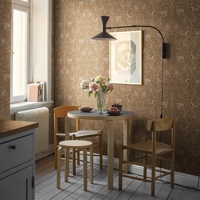 Udtrykket er klassisk og detaljerigt med tydelige referencer til Arts and Crafts-traditionens fortællende og naturromantiske univers. Jo længere man ser på tapetet, jo flere små detaljer og stemninger træder frem, hvilket giver væggen en levende, men stadig harmonisk karakter.